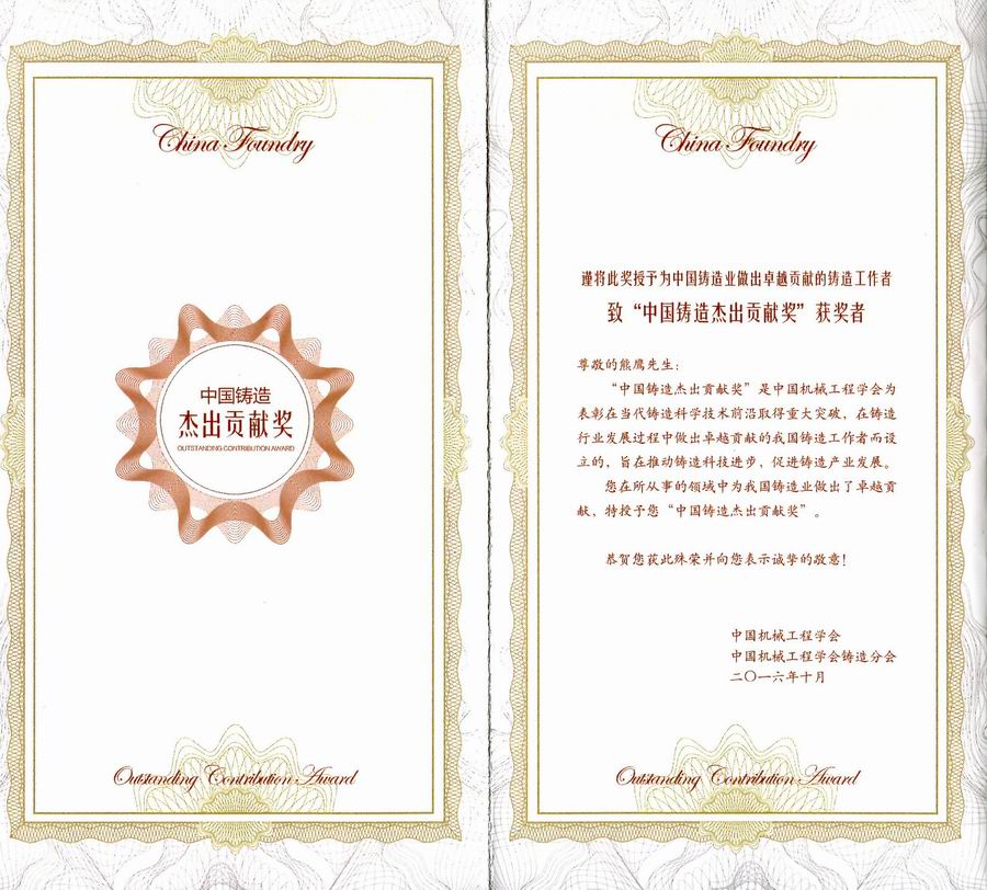 熊鹰董事长荣获中国铸造杰出贡献奖