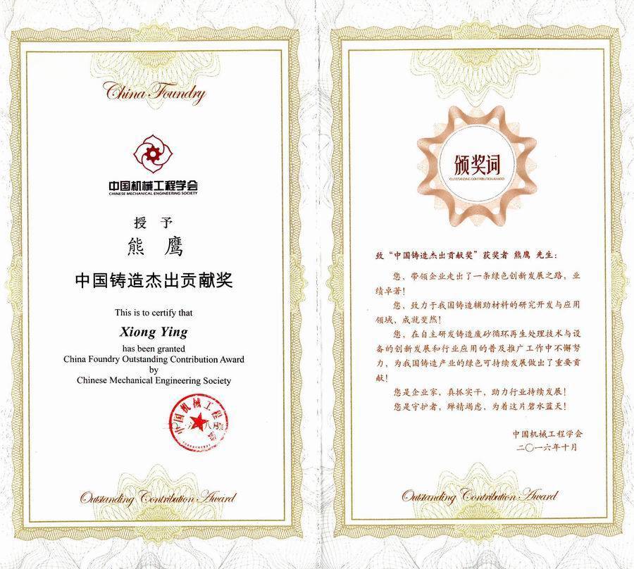 2016年10月28日,在成都金牛宾馆举行的第六届中国机械工程学会第十三届全国铸造年会上举行了“中国铸造终身成就奖”、“中国铸造杰出贡献奖”颁奖仪式。重庆长江造型材料集团公司董事长熊鹰先生荣获“中国铸造杰出贡献奖”。长江材料同时被评为优秀团体会员单位。